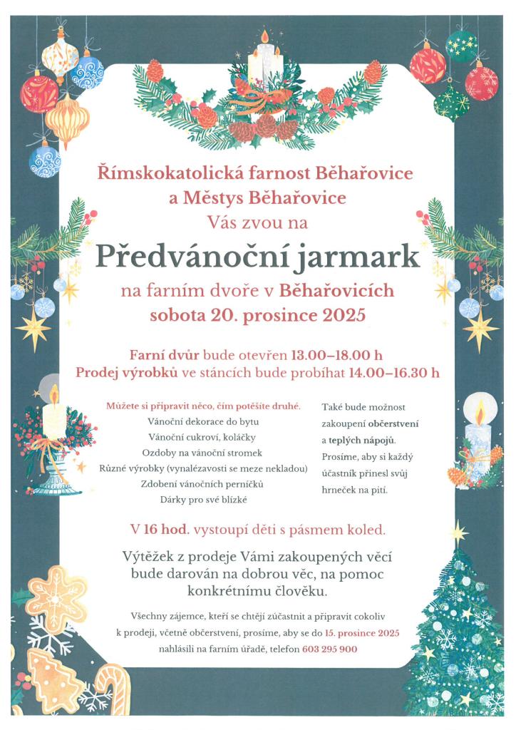 Předvánoční jarmark na farním dvoře v Běhařovicích v sobotu 20.12.2025 od 13 hodin.